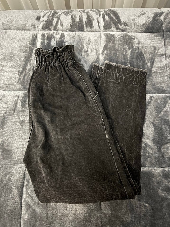 Siyah bağlamalı loose fit denim pantolon, midi boy ve tie-dye desenli. Günlük rahat kullanıma uygun.