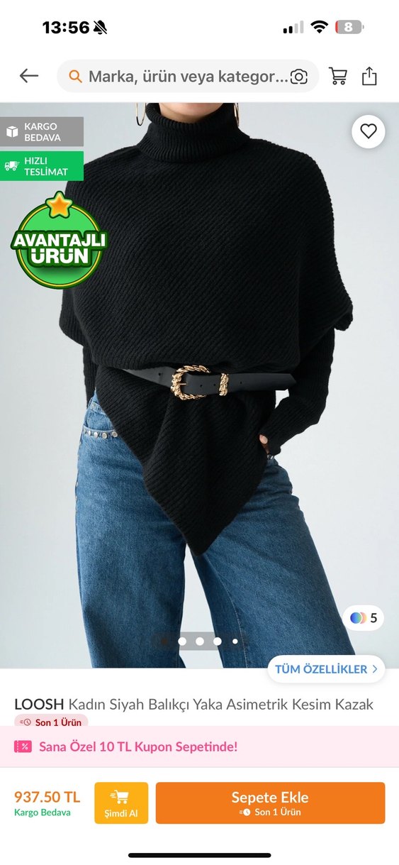 Siyah renkli, balıkçı yakalı ve asimetrik kesime sahip, bol kesim triko kazak. Kemerli ve askılı kolludur, günlük rahat kullanım için uygundur.