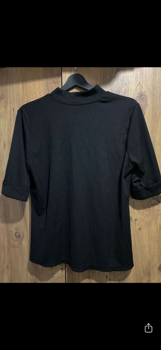 Siyah renkte, balıkçı yaka ve kısa kollu kadın bluz. Yumuşak ve sıcak kumaştan, rahat kesimli, günlük kullanıma uygun şık bir parça.