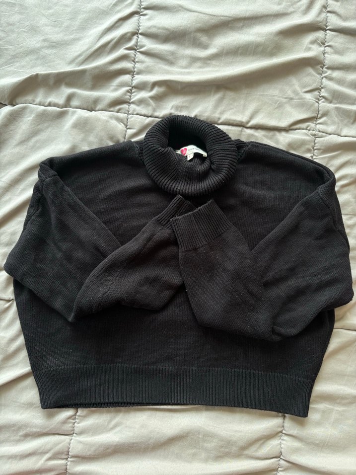 Bu siyah kadın kazak, örgü dokusu, balıkçı yaka ve uzun kollu tasarıma sahiptir. Rahat kesim, normal midi boyda ve yumuşak kumaştan yapılmıştır.