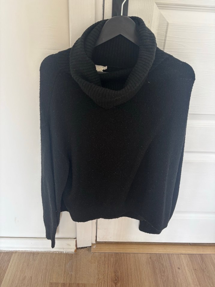 Kadın siyah renkli, yumuşak yün dokulu, uzun kollu, balıkçı yaka ve bol kesim örgü kazak. Rahat ve günlük sokak stili için uygundur. ( fotografta goruldugu kadar pamukkanmasi var )