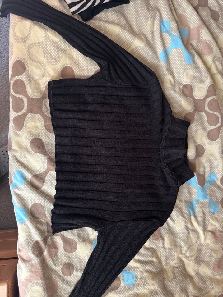 Siyah kadın triko kazak, balıkçı yaka ve uzun kollu, vücuda oturan kesime sahip. Yumuşak sentetik örgü kumaştan, rahat ve günlük kullanıma uygun sokak stili. Yepyeni duruyor. Hic giymedim. Crop boyda