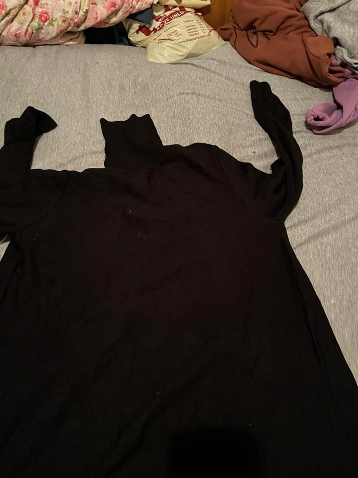 Bu siyah, balıkçı yakalı ve uzun kollu triko, yumuşak ve sıcak kumaştan yapılmıştır. Drapeli tasarıma ve midi boyda, günlük kullanım için uygundur.