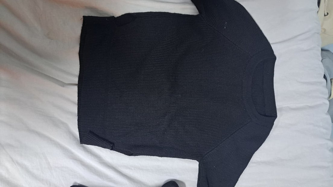 Kadınlar için siyah ve uzun kollu, yumuşak sentetik kumaştan yapılmış, vücuda oturan basic kazak. Yan tarafta minik pencere detayları var