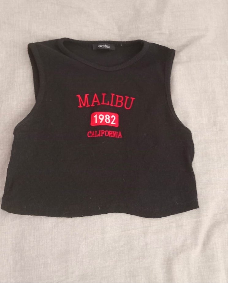 Kadınlar için siyah, baskılı ve vücuda oturan atlet. Yuvarlak yaka ve kolsuz, önünde "Malibu 1982 California" yazısı bulunur. Spor ve rahat tarz için uygun. ️