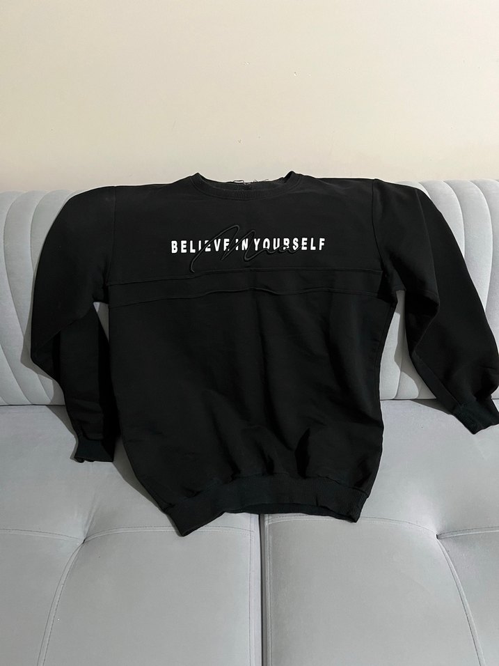 Siyah, baskılı ve belden kuşaklı, uzun kollu, yuvarlak yaka, rahat kesim sweatshirt. Yumuşak ve sıcak kumaştan, günlük kullanım için uygundur.