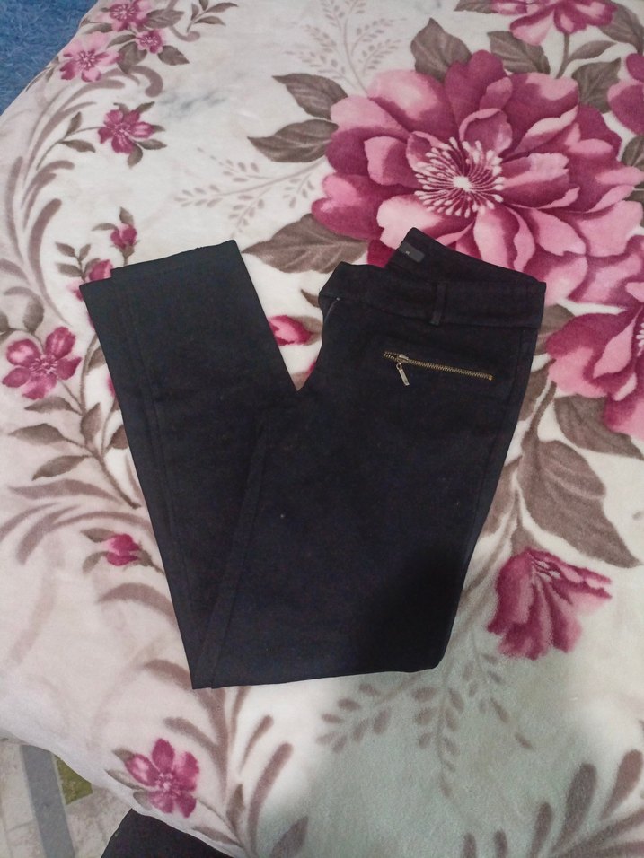 Dar kesim, siyah baskılı kumaş pantolonlar, fermuarlı ceplere sahip, sentetik materyalden üretilmiş, midi boyda, günlük sokak stili için uygun. beli 36 cm boyu 91 cm sadece bi düğmesi yok onun dışında bi deforme yok paça darlığı 14cm