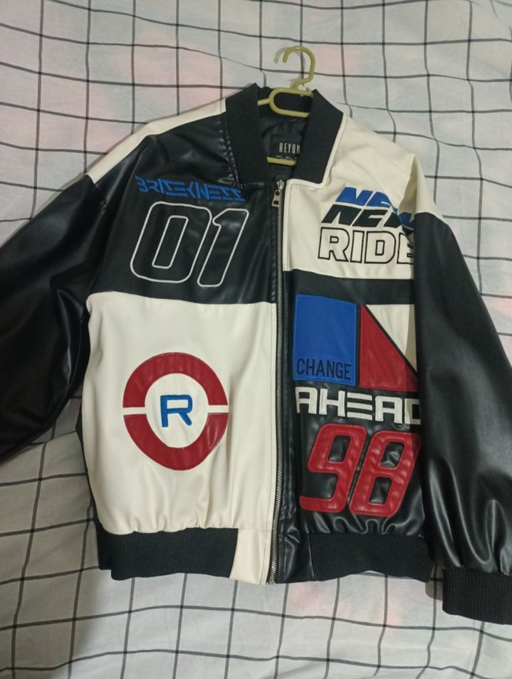 Kadın siyah deri biker ceket, baskılı desenli, bol kesim ve uzun kolludur. Fermuarlı ve yuvarlak yakalıdır, günlük kullanım için uygundur.
