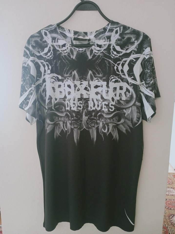 pamuklu kumaştan, kısa kollu, yuvarlak yakalı, baskılı gotik desenli, bol kesim siyah kadın tişörtü. Günlük kullanıma uygun rock punk havasında.