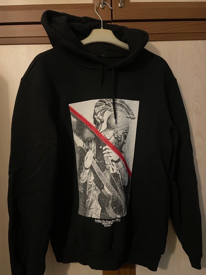 Uzun kollu, kapüşonlu ve baskılı siyah sweatshirt. Günlük kullanım için uygundur.