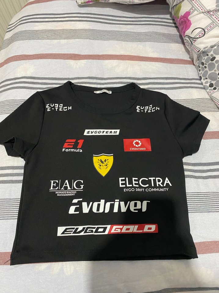 Siyah baskılı, kısa kollu, bisiklet yaka, normal boyda ve yapışkan bant detaylı kadın tişörtü. Sentetik kumaştan, spor ve sokak tarzına uygun.