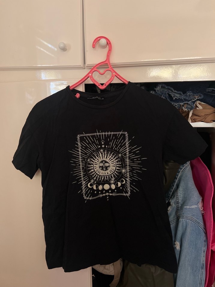 Siyah, baskılı, kısa kollu, yuvarlak yakalı ve bol kesim kadın tişörtü. Yumuşak dokulu kumaştan, günlük kullanıma uygun grunge punk tarzında. #tarot #tişört