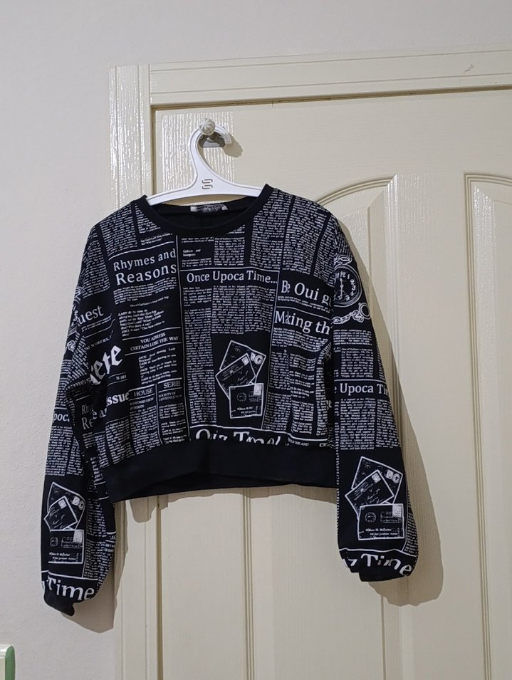 Kadınlar için uzun kollu, bol kesim ve bisiklet yaka olan siyah taban üzerine gri baskılı gazete desenli kısa sweatshirt. Sentetik kumaştan üretilmiştir, günlük sokak stili için uygundur.