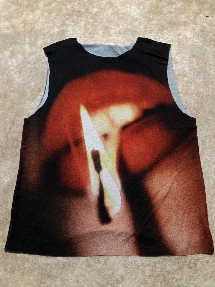 Kolsuz, siyah baskılı atlet, önünde yanan kibrit detayı. Yuvarlak yaka, vücuda oturan kesim ve yırtmaçlı. Sentetik kumaştan, sokak stili ve athleisure için uygun.