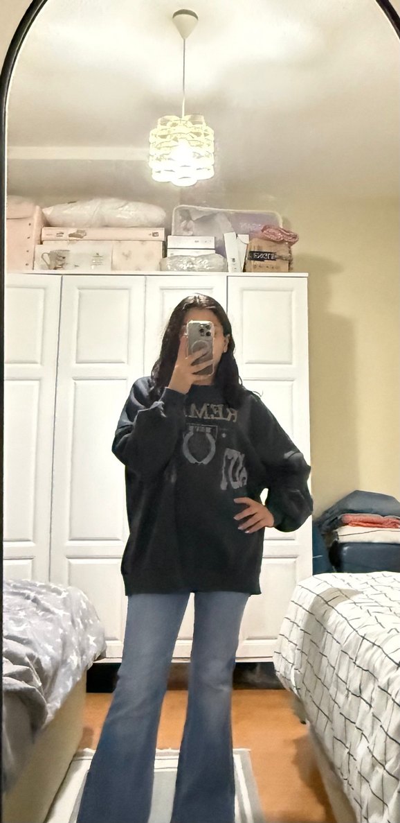 Kadınlar için siyah baskılı, oversize kesim, uzun kollu ve yuvarlak yakalı sweatshirt. Denim kumaştan üretilmiştir ve gündelik kullanıma uygundur.