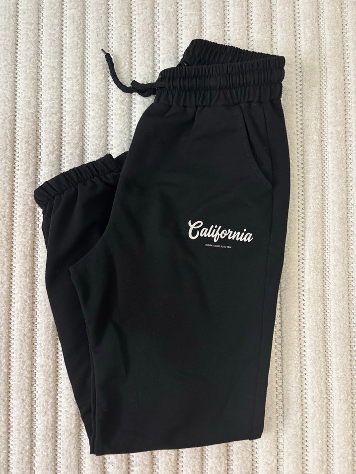 Yumuşak pamuklu, baskılı ve fermuarlı cepli siyah bol kesim eşofman altı. Dış mekanlarda rahat kullanım için uygundur. "California" baskılı.