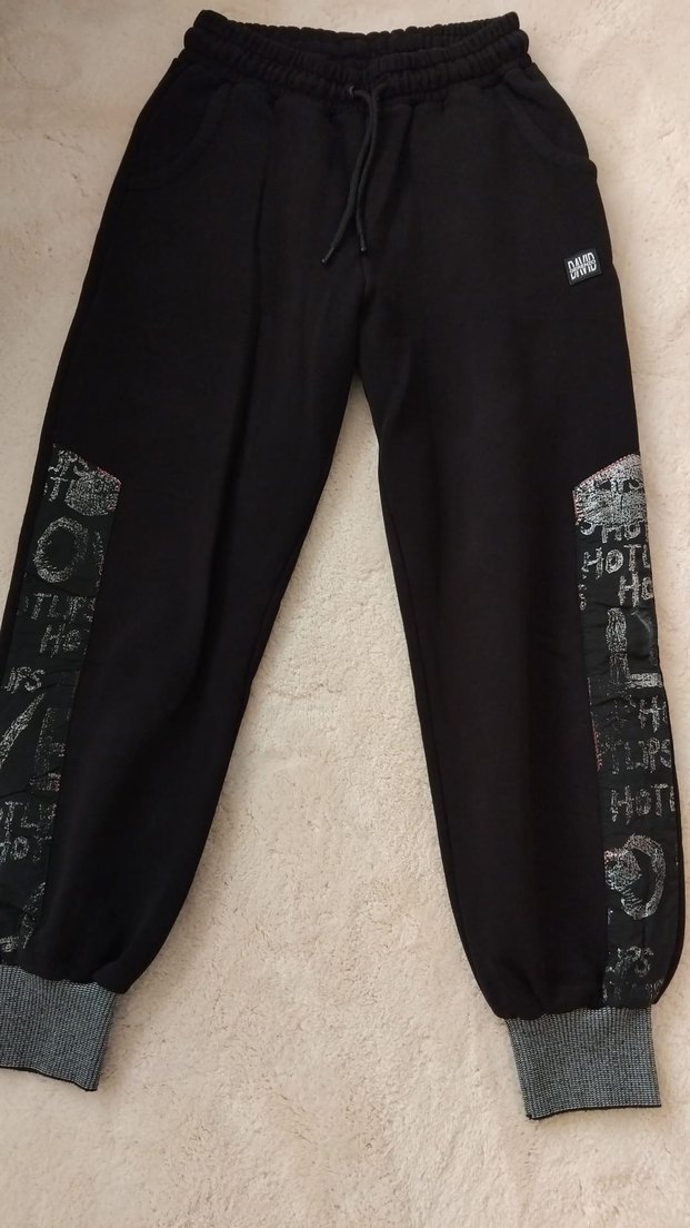 Kadınlar için rahat kesim, yanları baskılı siyah eşofman. Yumuşak ve sıcak kumaştan, cırt cırtlı kapama ve ribanalı paçalar içerir. M-L beden