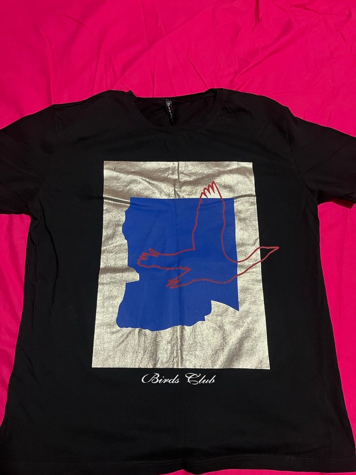 Siyah, pamuklu, kısa kollu, bisiklet yaka, rahat kesim tişört. Gümüş zemin üzerinde mavi ve kırmızı kuş baskılıdır. Romantik akşamlar için uygundur. ️