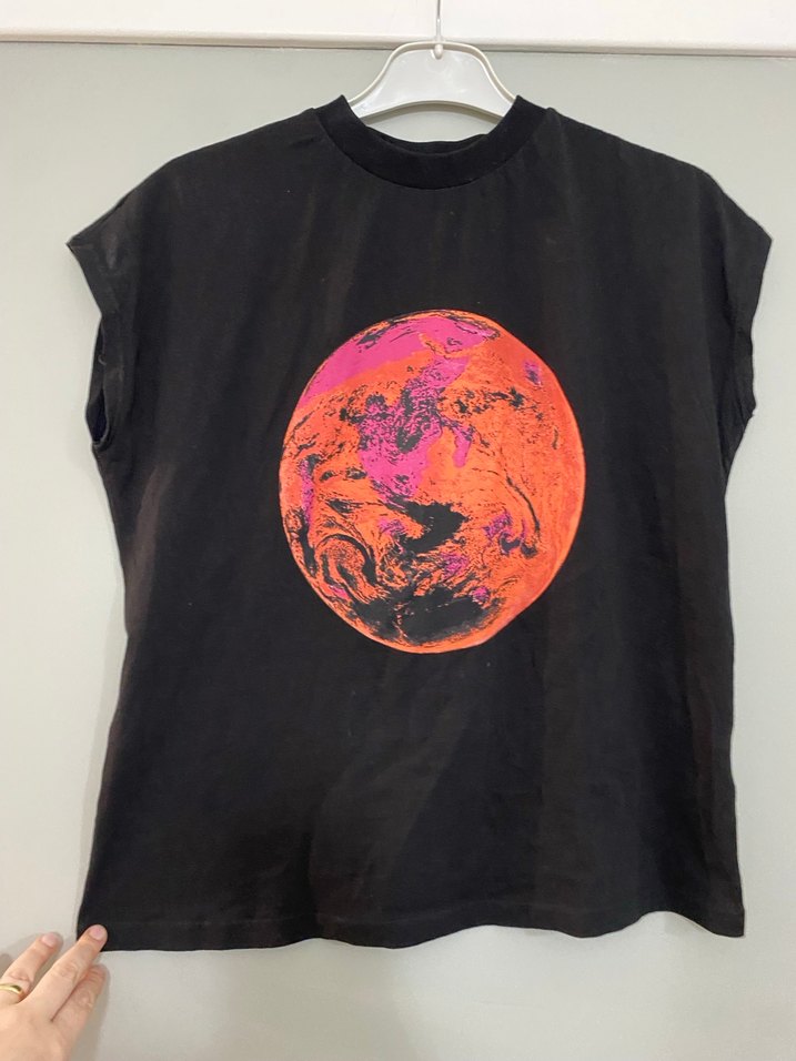 Siyah, salaş kesim kadın tişörtü, önünde canlı turuncu ve pembe baskı deseni bulunur. Kısa kollu ve yuvarlak yakalı, grunge punk tarzında dış mekan kullanıma uygundur.