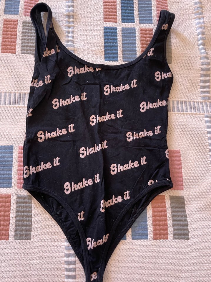 Baskılı 'Shake it' yazılı, tokalı askılı, parlak siyah renkli, normal boyda, vücuda oturan kadın mayo. Parti ve sokak stili için uygun.