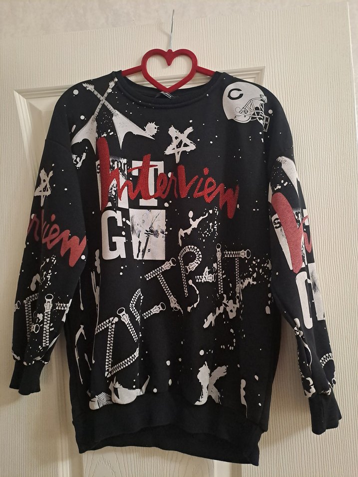 Siyah renkli, uzun kollu, bisiklet yaka ve bol kesim kadın sweatshirtü. Dokuma kumaş üzerine baskılı grunge punk desenleri bulunur. Günlük kullanıma uygun, normal boyda bir model.