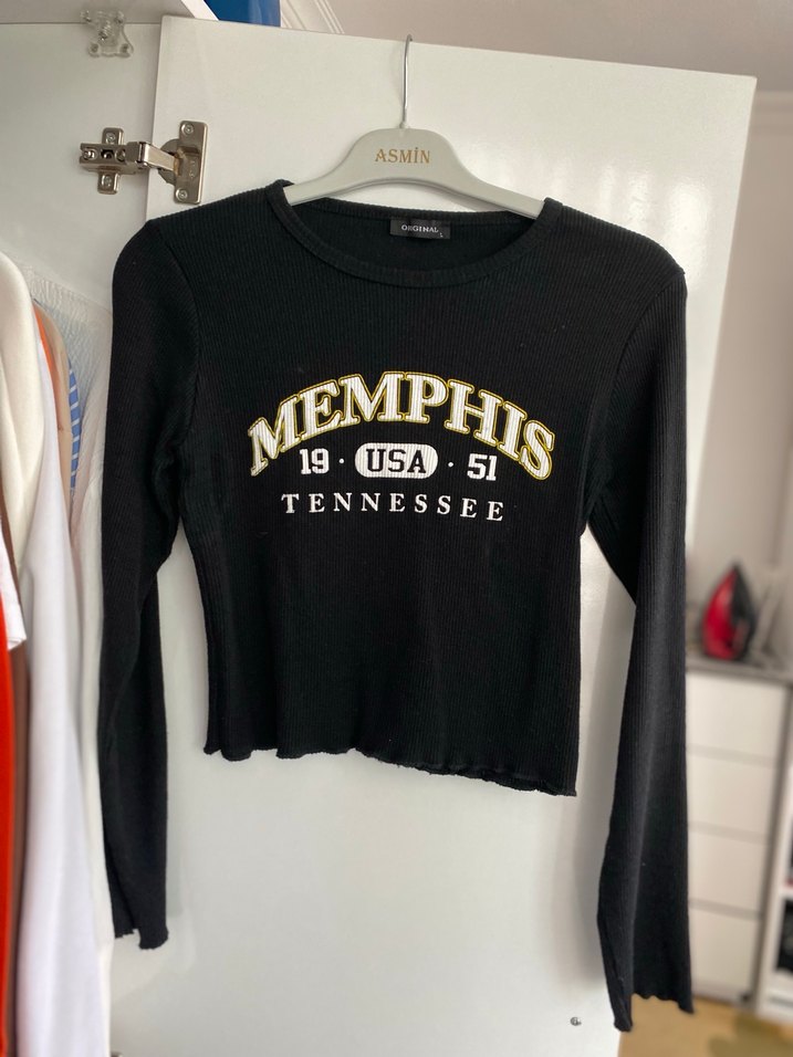 siyah, baskılı ve uzun kollu tişört. Yuvarlak yaka, bel detaylı ve sentetik kumaştan, trend sokak stili için uygundur.