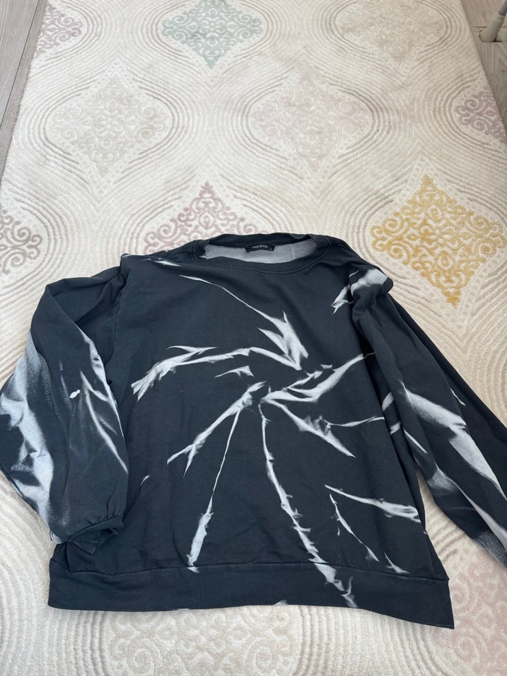 Kadınlar için siyah batik desenli, uzun kollu, yuvarlak yakalı, bol kesim ve dökümlü tarzda sweatshirt. Yumuşak sentetik kumaştan üretilmiştir, günlük rahatlık için uygundur.
