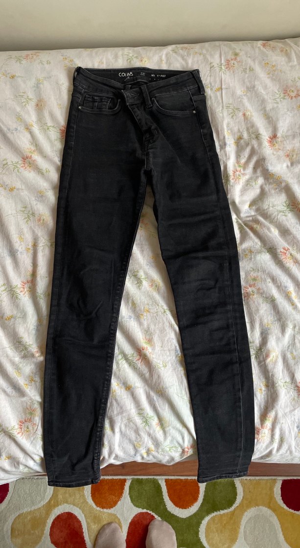 Siyah batik desenli, dar kesim kadın kot pantolon. Kot kumaştan, tokalı detaylı, midi boyda, günlük kullanıma uygun.