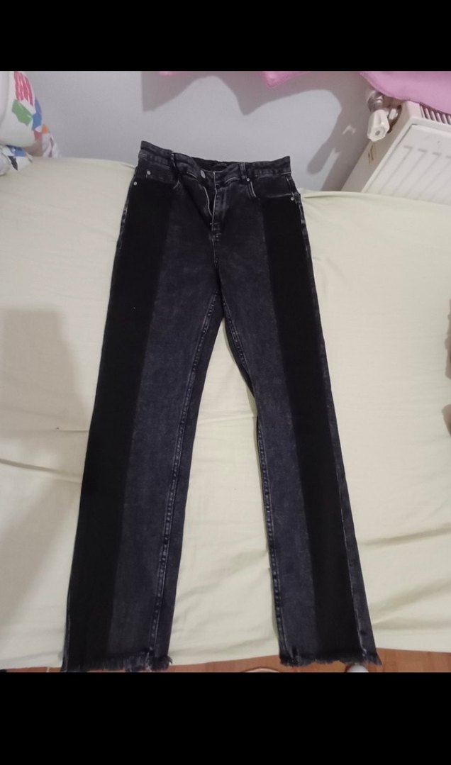 Siyah denim pantolon, mom jeans, skinny değil, likralı esnek kalın tok bir kumaşı var