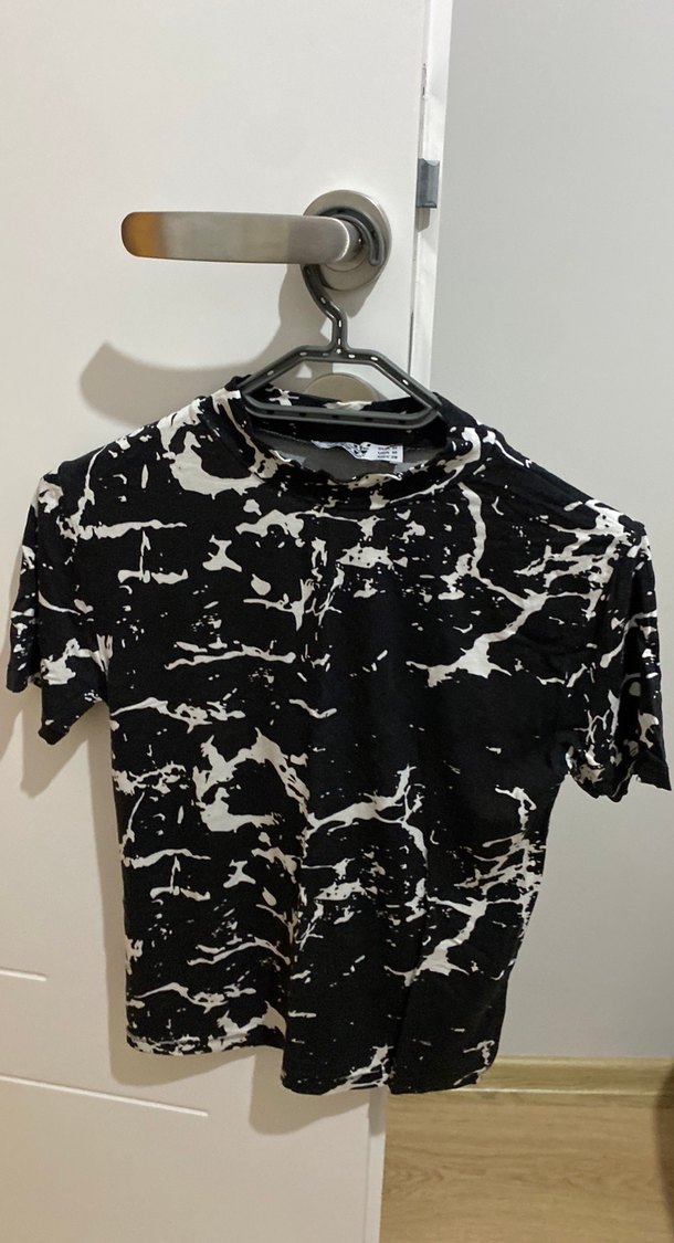 Kadınlar için dar kesim, yüksek yakalı ve kısa boyda, siyah-beyaz batik desenli, sentetik kumaştan şık sokak stili bluz.