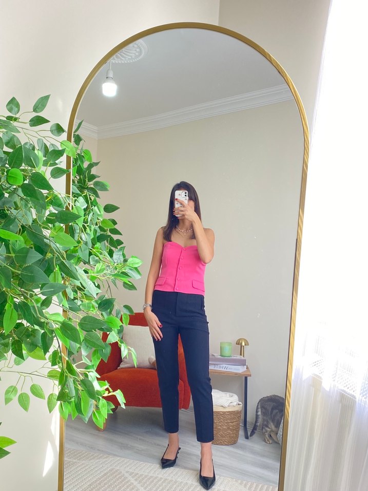 Kadınlar için normal kesim ve midi boyda, açık pembe batik desenli sigara pantolon. Sentetik kumaştan üretilmiş, ofis için şık ve rahat bir seçim.