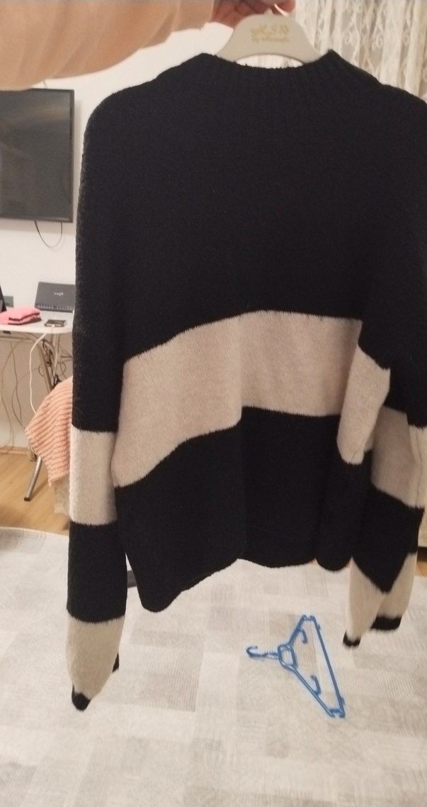 Kadınlar için siyah ve bej renklerde, boğazlı ve uzun kollu, triko kumaştan yapılmış rahat kesimli kazak. Günlük kullanıma uygundur.