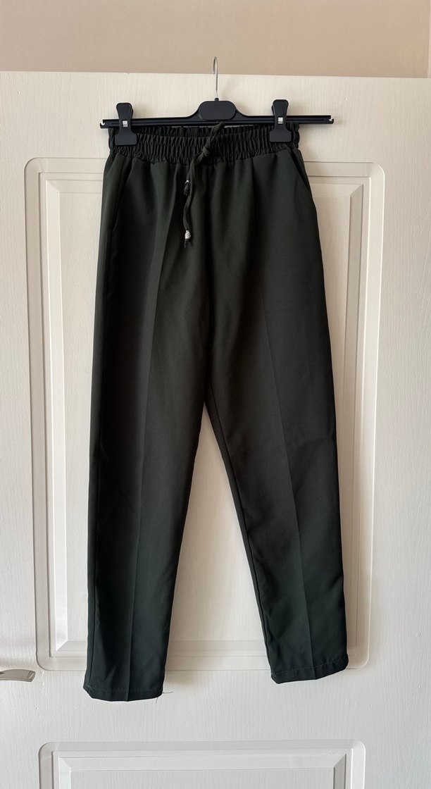 Kadınlar için regular fit, bel bantlı siyah kumaş pantolon. Yumuşak sentetik kumaştan üretilmiştir. Günlük kullanıma uygundur.