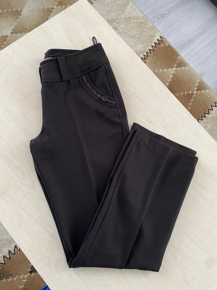 Kadınlar için siyah kumaş pantolon, regular fit ve kemer detaylı. Ofis ve sokak stiline uygun midi boyda, sentetik kumaştan üretilmiştir.