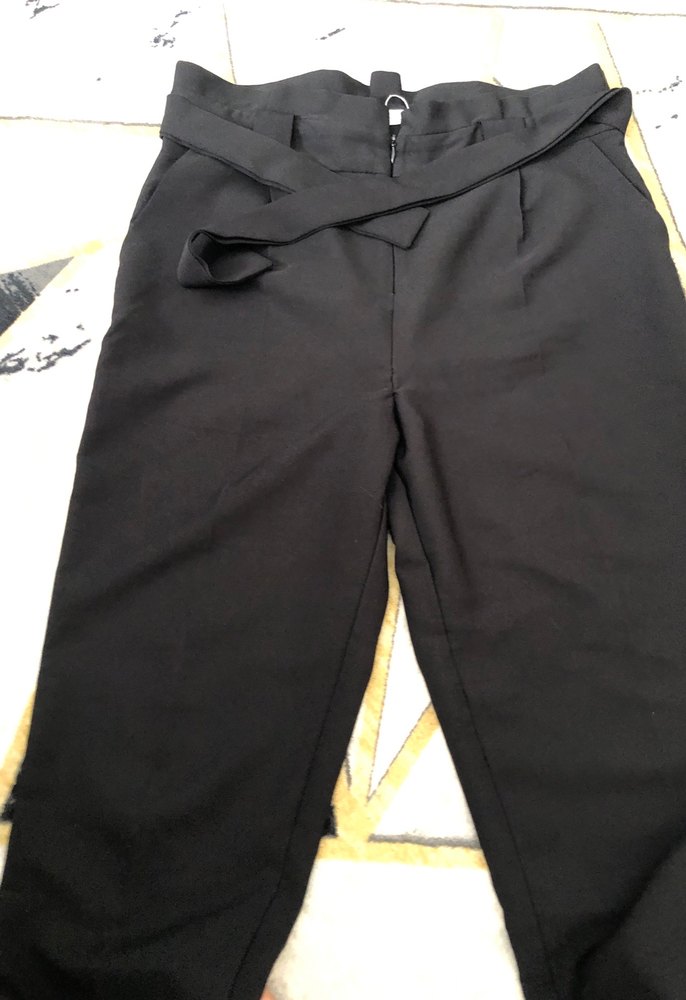 Kadınlar için bel detaylı, rahat kesimli, midi boy siyah kumaş pantolon. Günlük ve iş stili için uygundur.