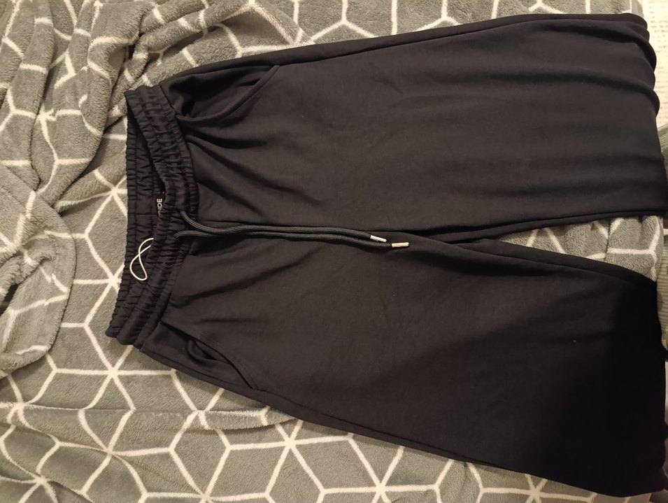 Kadınlar için beli bağlamalı, bol kesim ve midi boyda siyah rahat sweatpant. Yumuşak sentetik kumaştan, günlük sokak stiline uygun.