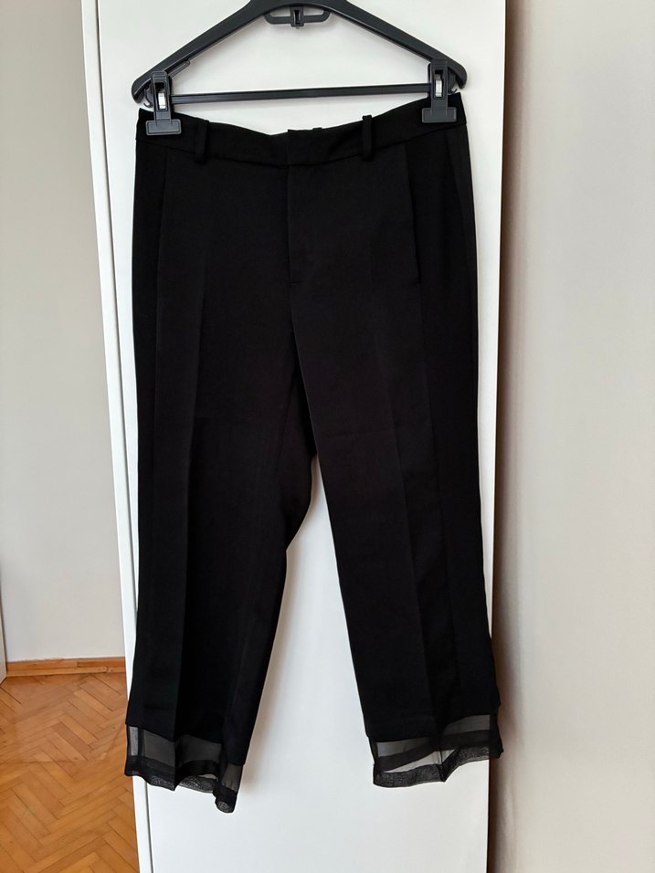 Kadın siyah midi kumaş pantolon, regular fit ve kemerli beli ile. Ofis ve sokak stili için uygun, ipeksi dokuda.