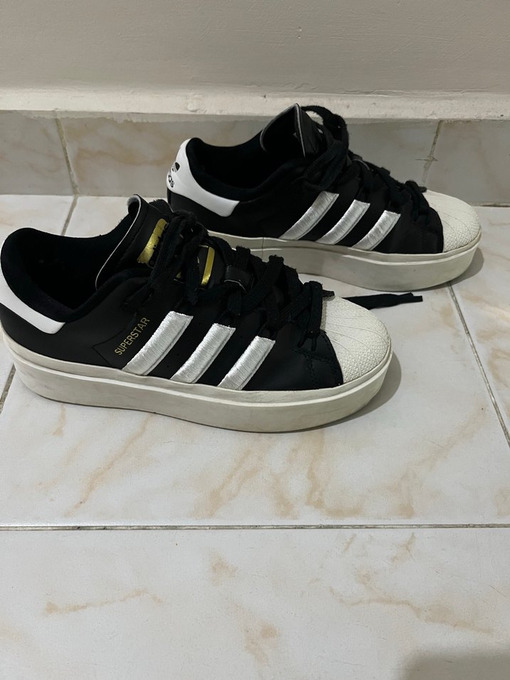 Adidas kadın spor ayakkabısı, düz taban, siyah beyaz çizgili tasarım ve bağcıklı rahat kullanım sunar. Spor ve günlük stil için uygundur. 37 1/3 numara. İç astarında deforme yırtılmalar var fotoğraftaki kadar. Gayet iyi durumda.