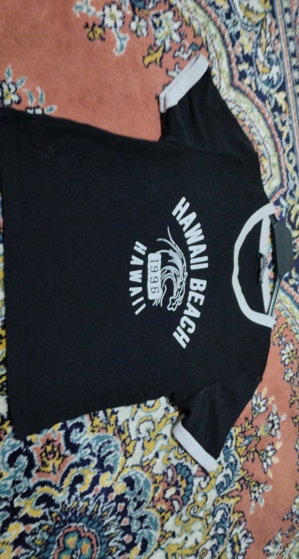 Siyah renkli, kadın crop. Sentetik kumaştan, yuvarlak yaka ve baskılı "Hawaii Beach" yazısı ile dikkat çeker.