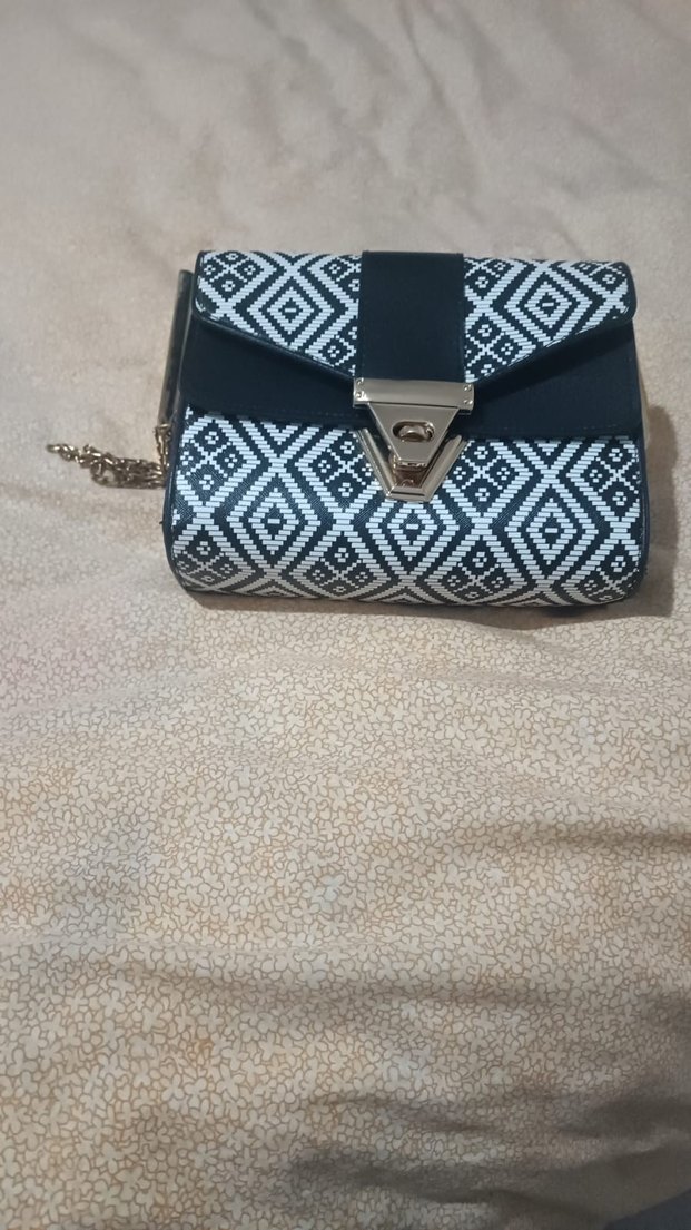 Kadın çantası, baskılı deseni ve tokalı kemer detayıyla modern bir tarz sunar. siyah ve beyaz tonlarında, sentetik kumaştan üretilmiştir.