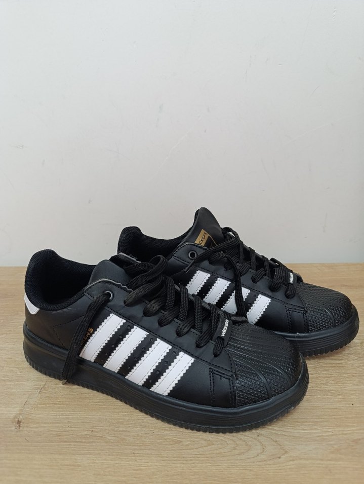 Siyah tabanlı, beyaz çizgili ve bağcıklı kadın spor ayakkabısı. Kauçuk tabanlı, sportif sokak stili için uygun. 37 numara fakat ayağım taraklı olduğu halde 37 numara büyük geldi bu yüzden 38 numara giyene rahatlıkla olur