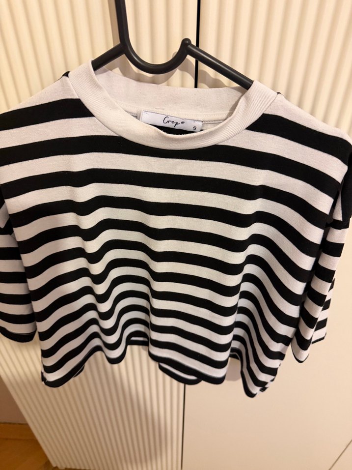 Kadınlar için siyah beyaz çizgili, yuvarlak yaka ve kısa kollu crop top. Pamuk kumaş, rahat ve salaş kesim sunar.