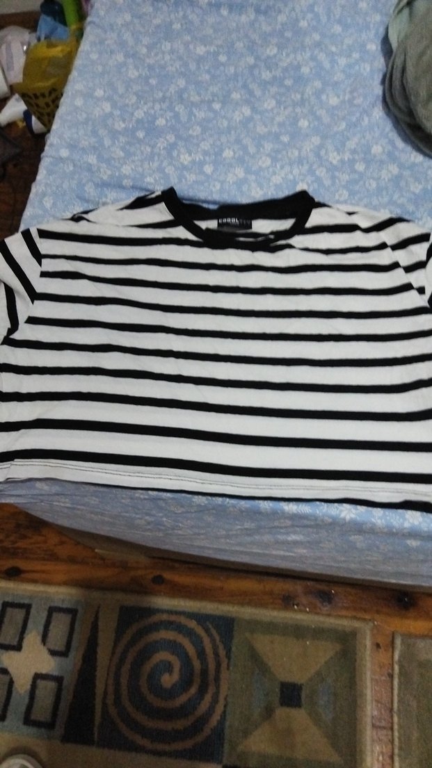 Pamuk kumaştan, kısa kollu ve tekne yaka kadın tişörtü. Siyah beyaz çizgili, günlük kullanıma uygun rahat bir model.