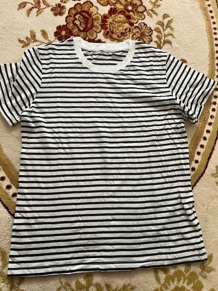 Kadınlar için pamuklu, kısa kollu, yuvarlak yakalı ve ince çizgili siyah beyaz tişört. Günlük kullanım için rahat ve şık, sokak tarzına uygun.