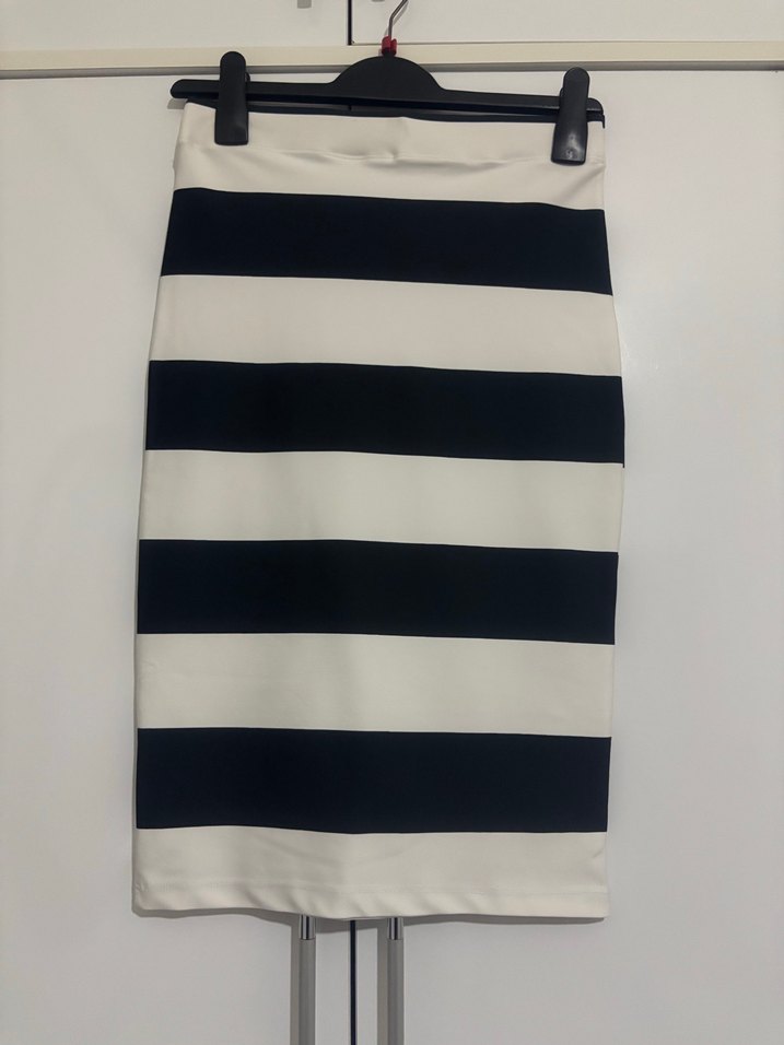 Sentetik kumaştan, siyah beyaz yatay çizgili, pilili ve midi boyda, vücuda oturan kalem etek. Ofis ve günlük sokak stili için uygun.