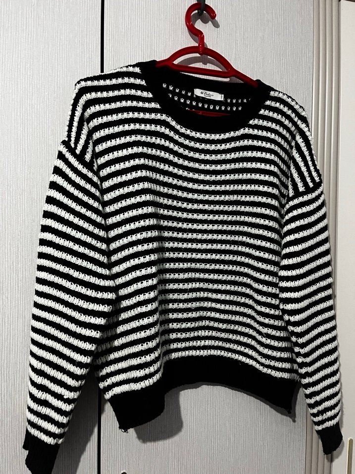 Kadınlar için siyah ve beyaz çizgili, uzun kollu, yuvarlak yakalı, rahat kesim örgü kazak. Günlük kullanım için uygun, trend sokak stiliyle uyumlu.