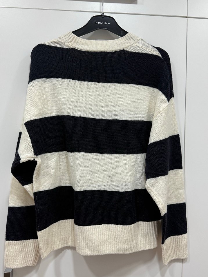 Bu örgü yün kazak uzun kollu ve yuvarlak yakalıdır. Siyah ve beyaz kalın çizgilerle tasarlanmış, rahat ve normal boyda bir kesime sahiptir.