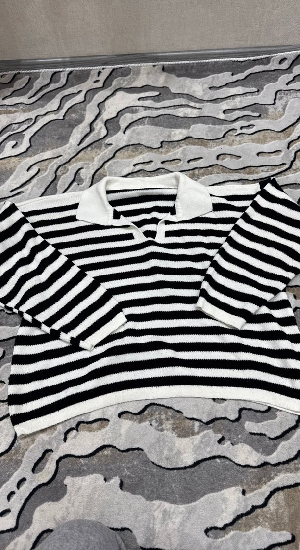 Pamuklu, uzun kollu, örgü, siyah beyaz çizgili ve salaş kesim kadın triko. Günlük sokak stili için uygun.