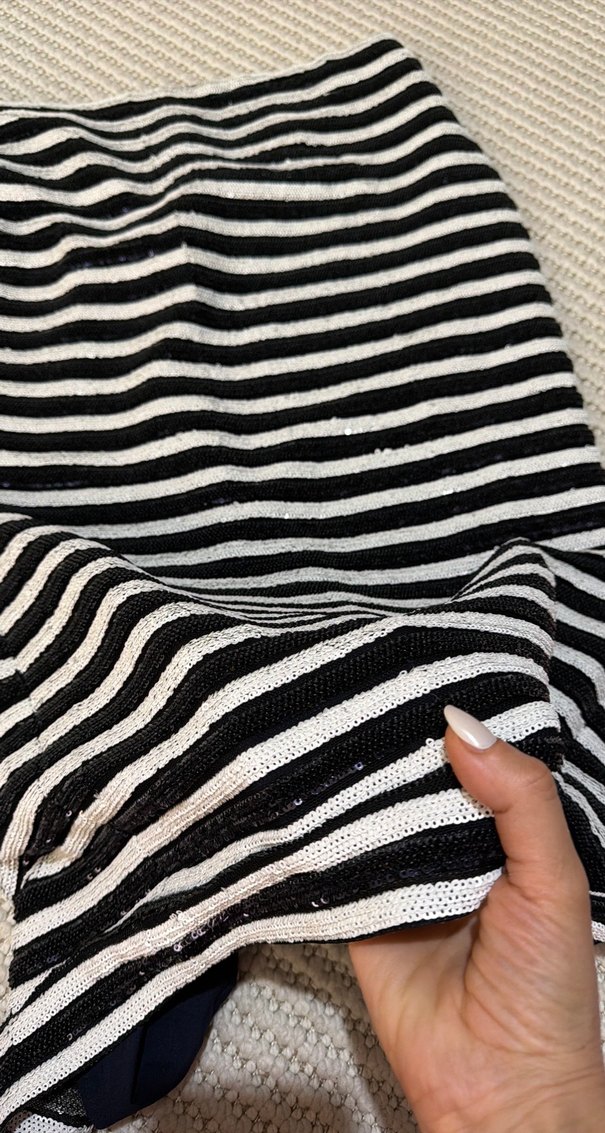 Kadınlar için siyah beyaz çizgili, pilili, tekne yakalı ve askılı kollu, midi boyda dar kesim elbisedir. Günlük kullanıma uygun, şık ve Paris sokak modasına uygun bir tasarımdır.