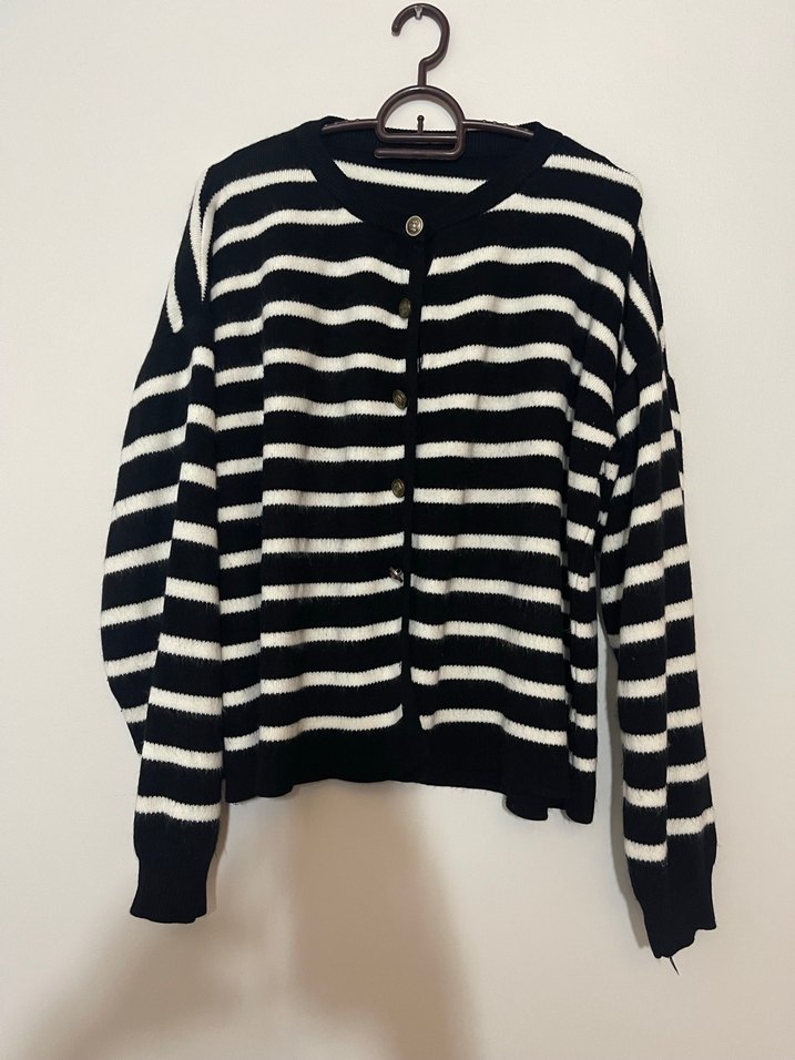Siyah beyaz çizgili, uzun kollu, yuvarlak yaka, triko kumaştan yapılmış, normal midi boyda ve bol kesim kadın hırka. Günlük kullanıma uygun, rahat ve şık. Kullanmış bir ürün.